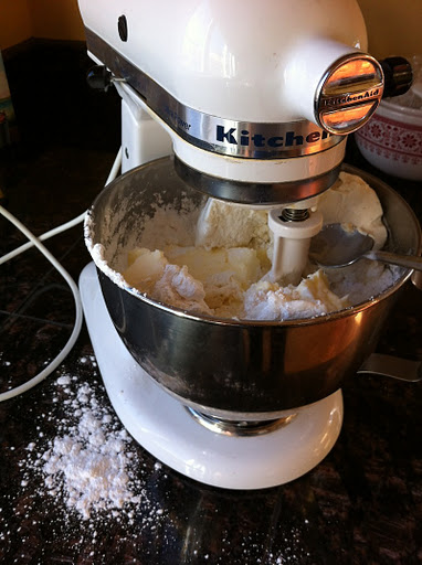 5. I have no tidbits about the cinnamon, but I do have a final mixing suggestion. Mix the ingredients a bit by hand first to get the powdered sugar stuck to some of the rest of it. Otherwise, the butter and ice cream stick to the beaters and act as small firing weapons, flinging the powdered sugar out of the bowl. I’ve heard this can even happen at low speeds.