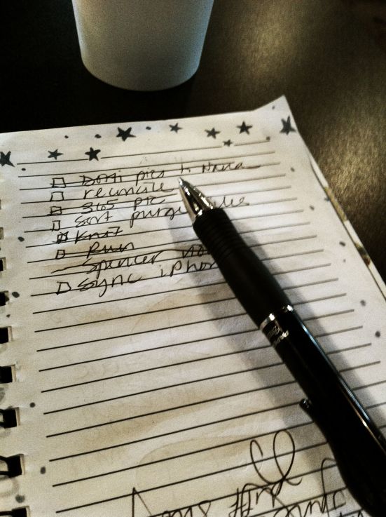 I guess what I’m saying is that it’s a balance. My list is great because it really does let me not dwell on what I want to be getting done, but I can easily switch to being driven by the list I created. Maybe I need to do a better job of scheduling my “nothing” time also. I’m trying. Did you see that I have “knit” written on my list in the photo… and that it’s crossed off before the financial reconciliation or iPhone syncing? Progress.